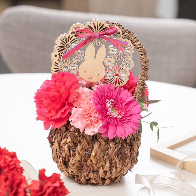 生花のカーネーションやガーベラなどをナチュラルなカゴに生けたアレンジメントです。ミッフィーの作者、ディック・ブルーナさんの描いたお花がデザインされた木製コースターが付属しています。付属のコースターは、お花を楽しんだ後飲み物を置くコースターとして、またはお花を生ける際のインテリアのアクセントとしてもお使いいただけます。