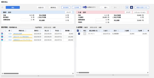 振込依頼人名の表記ゆれのほか、「税込・税抜処理」や「振込手数料」などによって生じる請求額と入金額の差異を考慮し、消込候補となる請求情報を自動でピックアップします。