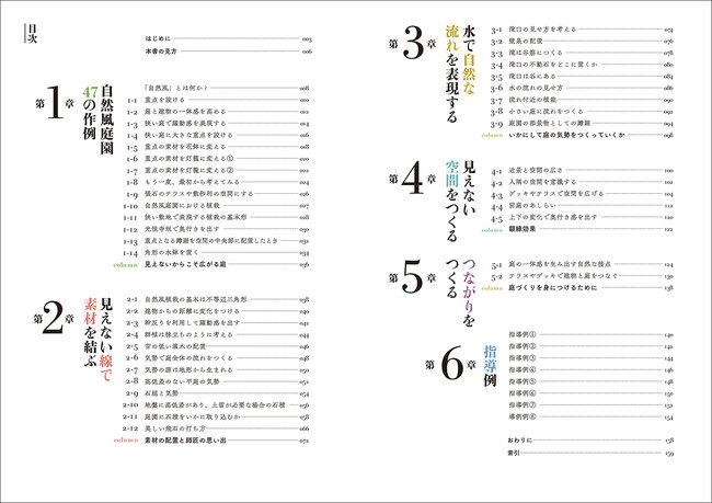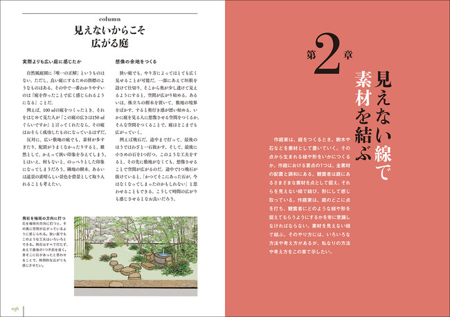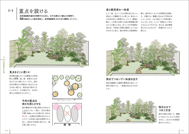 本書では、モデルとなる作例を紹介した後、水鉢や植栽の配置、石積みの高さ、飛石の打ち方、滝の見せ方など、