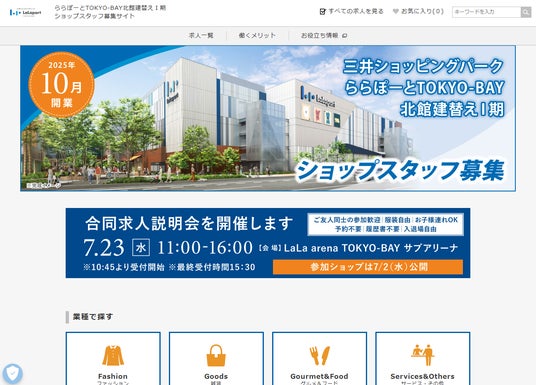 採用ホームページ構築サービス『Jobギア採促』※を導入して6月3日に施設専用のスタッフ募集サイトを開設。各出店企業の魅力のみならず施設で働くことによる各種メリットを打ち出すことができ、求職者をより効率的に集めることができます。24時間WEB応募も可能です。
