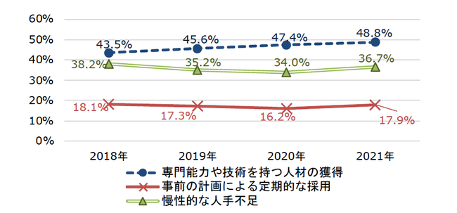採用理由は「新卒」「中途」ともに「専門能力や技術を持つ人材の獲得」が最多に【図2、3、4】