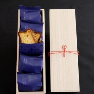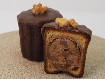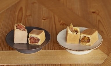 しっとりもっちりの新食感カヌレが登場。(上)オモテナシカヌレの中にコーヒー風味のあんこと胡桃を詰めて、上にチョコレートをトッピング。(下)桐箱に入ったオモテナシカヌレ・プラムは、贈答にもぴったり。