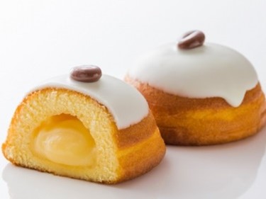 しっとりとしたスポンジに、朝霧牛乳を使用したまろやかなカスタードクリームを入れた洋風菓子。ホワイトチョコをかけ、冬化粧した富士山に見立てました。コーヒー味のチョコビーンズがアクセント。