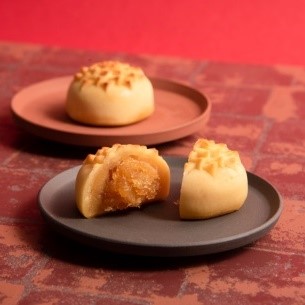 余計なものは一切加えず、素材の自然なおいしさを引き出すことにこだわっている〈サニーヒルズ〉から年越しだけの限定商品が登場!(上)台湾原種の香り高い完熟パイナップル、生地には新鮮なブランド卵やニュージーランド産グラスフェッドバターを使用した、香り豊かなパイナップルケーキ。(下)パイナップル果肉とカスタードに塩漬け卵黄を合わせた特製フィリングをなめらか生地で包み焼きあげた、この時期だけの月餅。