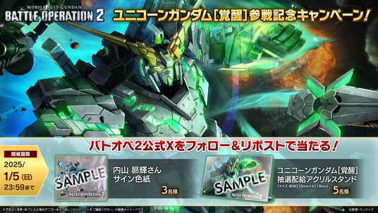 『バトオペ2』に「ユニコーンガンダム[覚醒]」の実装が決定したことを記念して、バナージ・リンクス役内山 昂輝さんのサイン入り色紙や、ユニコーンガンダム[覚醒] 抽選配給アクリルスタンドが当たるフォロー&リポストキャンペーンを実施中です。