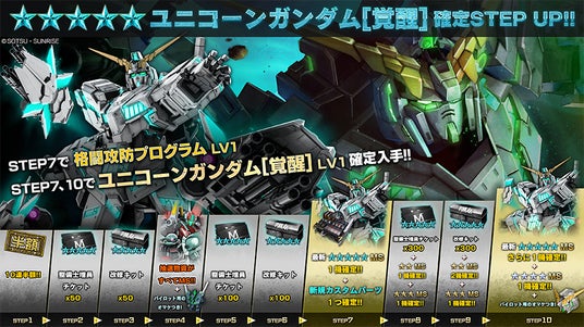 STEP10でもう1機確定+★4MS1機確定に加え、アバターアイテムがが手に入る「ユニコーンガンダム[覚醒]確定STEP UP抽選配給」を実施いたしますので、この機会に是非入手してください。