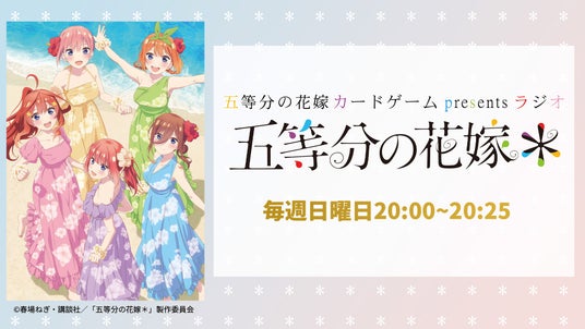 春場ねぎ先生の人気ラブコメディーマンガが原作のTVアニメ『五等分の花嫁』シリーズのラジオ番組の続編「五等分の花嫁 カードゲーム presents ラジオ『五等分の花嫁*』」の放送が決定しました!豪華メインキャストをゲストに毎週お迎えし、アニメ好き芸人の天津飯大郎さんとともに、作品やキャラクターの魅力をたっぷりお伝えします。TVスペシャルアニメ『五等分の花嫁*』や、オリジナルトレーディングカードゲーム「五等分の花嫁 カードゲーム」の最新情報もお伝えします。