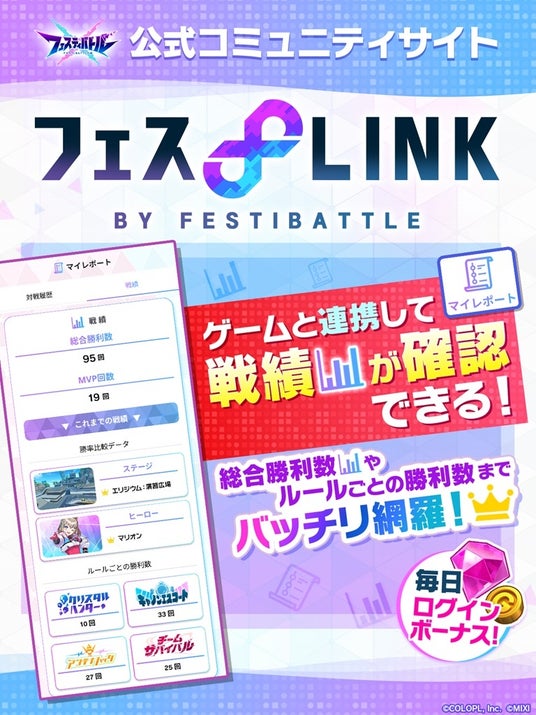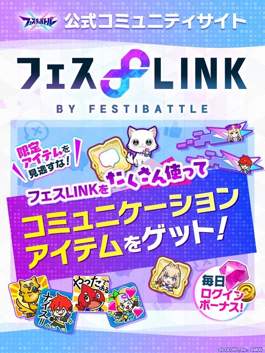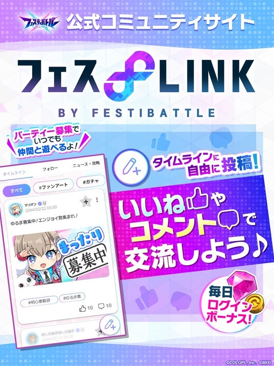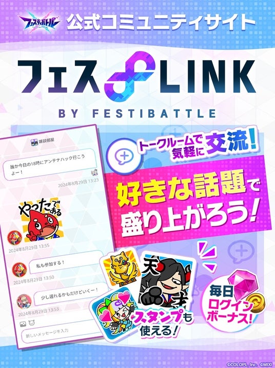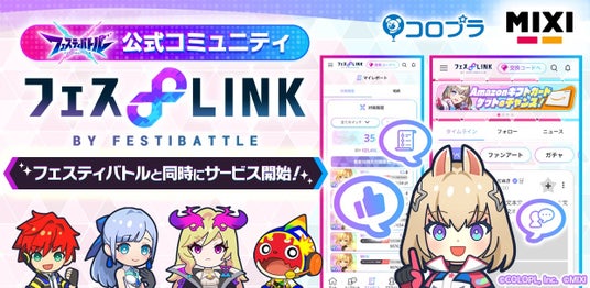 株式会社コロプラ(代表取締役社長:宮本貴志、本社:東京都港区、以下「コロプラ」)は、株式会社MIXI(代表取締役社長 上級執行役員 CEO:木村弘毅、本社:東京都渋谷区、以下「MIXI」)と共に取り組んでいるスマートフォン向け新作ゲーム『フェスティバトル』について、2024年8月30日(金)のサービス開始とともに公式コミュニティサイト「フェスLINK」もオープンしました。