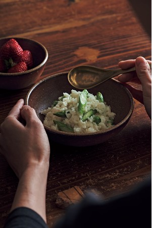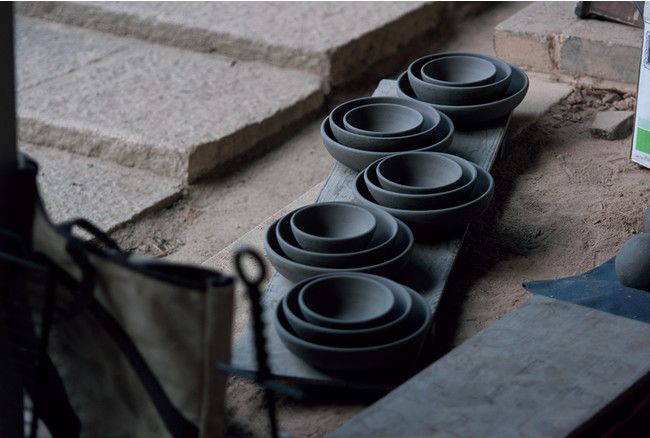 室町時代まで遡る備前焼窯元六姓のひとつ、木村家の流れをくむ 「一陽窯」。和樂のコラボはすでに6回目。今回木村さんにリクエストしたのは、「大きさ違いの3点ですっきり収納でき、混ぜて食べるような料理にも適した深さ」のうつわ。すでに一陽窯で販売されていた「高台のない小ぶりな丼」をイメージしました。