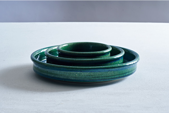 これは「鉢」とはいえ底面は平らで、側面が垂直に立ち上がる縁付きの定番品ですが、ディナープレートとしても使いやすい直径約21cm、取り分け皿にちょうどいい約15cm、そして約10cmの3点をセットに。日本のうつわの基準でいえば、大は7寸、中は5寸ですが、小のサイズが3寸(約9cm)では立ち上がりがある分ちょっと使いづらそう。そこで10cmという絶妙なサイズをオーダー、和樂オリジナルセットができあがりました。