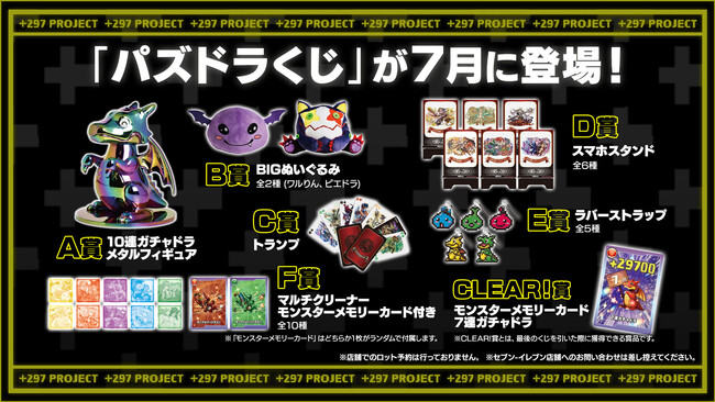 さらに各店で最後のくじを引いた方が手にすることができるCLEAR!賞の「モンスターメモリーカード7連ガチャドラ」(全1種)は、+29700ポイントと「7連ガチャドラ」に加えて、「厳選ガチャ(パズドラくじ)×7連」が獲得できる「モンスターメモリーカード」となっています。