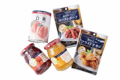 〈明治屋〉果実実感 つぶつぶイチゴジャム(340g)298円、おいしいフライドチキン(50g) 250円、フルーツマーケット白桃(425g) 498円