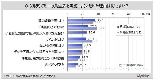 グルテンフリー生活の実施経験者では「腸内環境改善によい」「血糖値の上昇を防ぐ」「ダイエットによい」が、グルテンフリー生活を実施したくないと回答した人では「好きなものが食べられない」「ストレスがたまる」「グルテンフリーの食品を確認・準備するのが大変」が上位となっています。