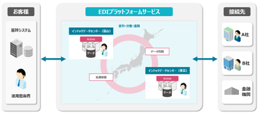 今回、提供開始する「EDIプラットフォームサービス」は、遠隔地の二拠点間で稼働し、拠点間で常にEDIデータや処理状況を同期することで、今までEDIでは不可能と考えられていた、並列・分散処理を可能にしました。これにより、災害時においてもお客様のビジネスへのインパクトを限りなく“ゼロ”にします。