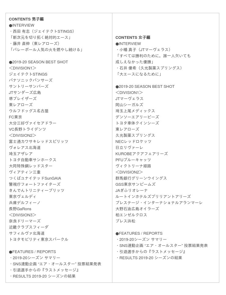 男子はDIVISION1(V1)からDIVISION3(V3)まで、女子はV1・DIVISION2(V2)の各チームの試合模様のベストショットからセレクトして構成された本誌らしく、表紙もシーズン中を思い出させるカットが使用されています。