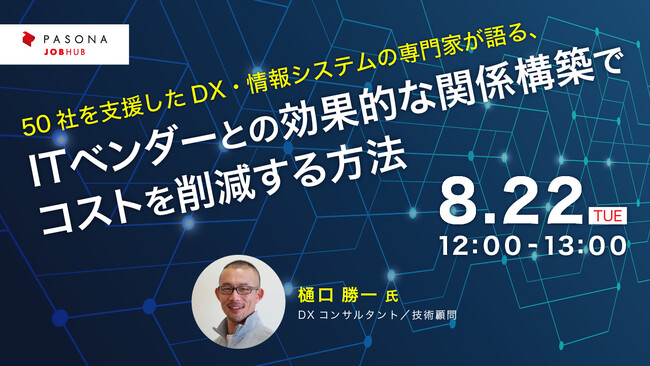 プロフェッショナル人材の力で経営者が抱える様々な課題を解決する株式会社パソナJOB HUB(本社:東京都港区、代表取締役社長 高木元義)は、ウェビナー『50社を支援したDX・情報システムの専門家が語る、ITベンダーとの効果的な関係構築でコストを削減する方法』を8月22日(火)に開催いたします。