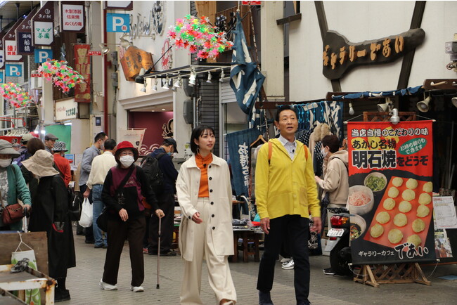 はじめは、「うおんたな」で親しまれる明石の台所「魚の棚商店街」をぶらり。昼網と呼ばれるせりで買い付けたばかりの新鮮な海の幸が並びます。明石名物・たこに惹かれた2人は「たかはしや」で、甘辛く炊いたプリプリのたこを頂きます。