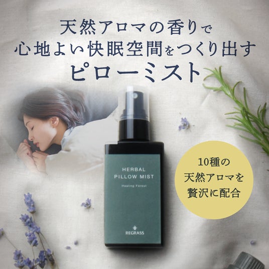 「香り」から快眠へアプローチ安眠に効果的な10種類の天然アロマをブレンドしたピローミスト。ケミカルでは再現できない、天然ならではの豊かで深みのある香りが、心と身体の緊張をときほぐし、心地よい眠りへと誘います。