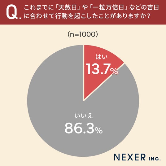 13.7%の方が、これまでに天赦日や一粒万倍日などの吉日に合わせて行動を起こしたことが「ある」と回答しています。
