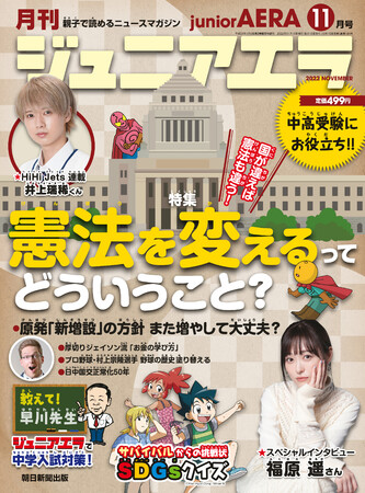小中学生が親子で読めるニュース月刊誌「ジュニアエラ11月号」が2022年10月15日(土)に発売されます。11月号の特集は「憲法を変えるってどういうこと?」。ニュース解説では、「原発新増設の方針」「日中国交正常化50年」「ヤクルト村上宗隆選手の大記録」を掘り下げて解説します。インタビューは、NHK連続テレビ小説「舞いあがれ!」主演の福原遥さん。HiHi Jetsの連載には井上瑞稀くんが登場。小学生に大人気の科学漫画「サバイバルシリーズ」からSDGsクイズも紹介しています。中学受験・高校入試に役立ち、学びも楽しさもぎっしり詰まった一冊です。