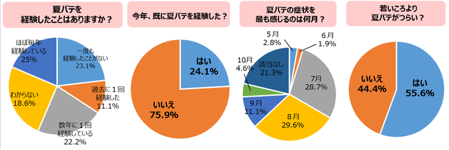 今回の調査によると、60代女性の4人に1人が毎年夏バテを経験。55.6%が若いころより夏バテがつらいと感じていることがわかりました。また、およそ2割の人がコロナ禍で夏バテがひどくなったと回答。その理由は、「マスク生活で息がしづらいから」「外出が減り、冷房にあたる時間が増えたから」「リフレッシュ方法が少なくなったから」という声が多くあがりました。