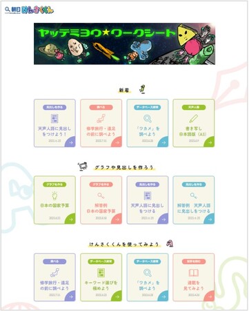データベースを活用する工夫として、ワークシートも充実。「調べる」「グラフを作る」「見出しをつける」など、プラスアルファの使い方の提案をしています。英語学習にも対応。和英対照の「天声人語」や「社説」、朝日新聞社の英語ニュースサイト「The Asahi Shimbun Asia & Japan Watch」も見られます。