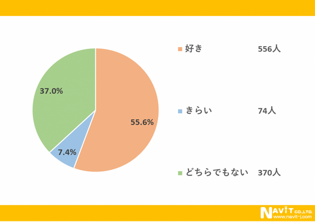 「海は好きですか?」という質問については、「好き」が55.6%、「きらい」が7.4%、「どちらでもない」が37.0%という結果になり、海が好きな人は半数程度だということが分かりました。