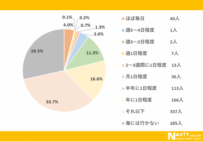 「海へはどのくらいの頻度で行きますか?」という質問については、「(年に1日)それ以下」が33.7%、「年に1日程度」が16.6%、「半年に1日程度」が11.3%と、海へ行く頻度はあまり多くない人ばかりのようでした。