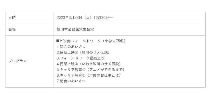 一般社団法人日本昔ばなし協会は、日本中に残された海にまつわる民話を発掘し、その民話のストーリーとその民話に込められた「想い」「警鐘」「教訓」を、親しみやすいアニメーションとして映像化しました。3月28日(火)福島県鮫川村にて鮫川村を舞台に制作したアニメ「鮫川のサメ伝説(化身した黄金の鮫)」の上映会フィールドワークを実施いたしました。