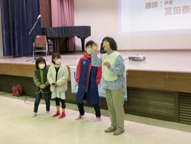 また、声優の冨田さんの講演では、発声練習やレクリエーション、生アフレコ披露といったコンテンツを交えたことで、子供たちは楽しみながら声優のお仕事について学ぶことができました。上映会終了後、生アフレコで冨田さんが声を当てていたセリフを真似して話す子供もいて、子供たちにとって貴重な経験となりました。