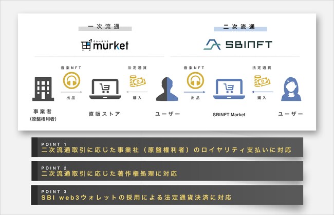 2023年6月23日(金)から、レコチョク、SBI VCトレード及びSBINFTの連携により、権利者が希望した音楽NFTは、NFT発行元である事業者(原盤権利者)やクリエイターへのロイヤリティ支払い及び各管理団体への著作権使用料の支払いを日本国内限定で対応する仕組みを構築。ユーザーは、著作権使用料の支払いを前提に、審査承認済みのアーティストが作るNFTだけを取り扱うパブリックチェーン型NFTマーケットプレイス「SBINFT Market」内で売買することが可能になります。なお、「murket」で販売した音楽NFTの二次流通は、現時点では「SBINFT Market」のみの対応となります。