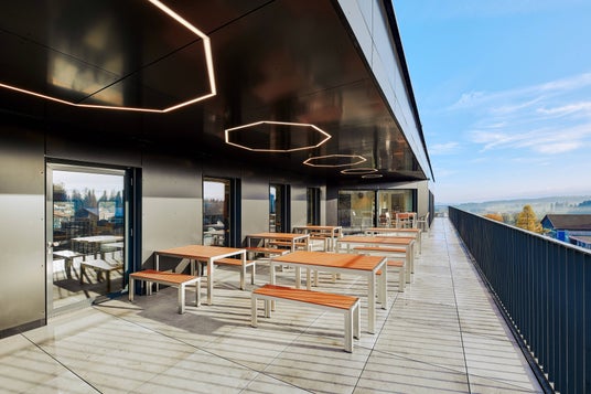 さらに約130人のスタッフの健康的な生活を考慮し、工房にはレストランと屋外テラスを備えたウェルネスおよびレクリエーションのためのエリアも加えられました。