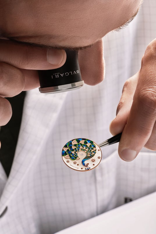 ブルガリを象徴するコレクションである「セルペンティ」「オクト フィニッシモ」「ブルガリ・ブルガリ」、そしてハイジュエリーウォッチの功績により、伝統的なメティエダール (芸術的かつ工芸的な技法) で作り出されたダイヤルがさらに求められるようになっています。希少な専門知識と芸術的技術の融合から生まれたこれらのダイヤルは、ハードストーンと孔雀の羽それぞれのマルケトリ、色石のセッティング、マイクロペインティングに特化した部門で製作されるようになります。クラフツマンシップが発揮される場にふさわしい静寂と落ち着きに満たされたこの新しいスペースには、ダイナミックな流れと呼応力、クリエイティビティが息づいています。