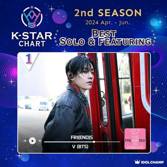 2024年1月よりスタートしたK-STAR CHART 2024年4月~6月の投票上位者を対象にした決算投票より、「2nd Season Chart」が確定。「BEST SOLO&FEATURING」部門でVの「FRI(END)S」が、「BEST SELF-PRODUCED IDOL」部門でRM(BTS)が1位に輝きました。