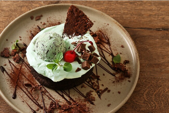 カカオを練り込んだふわふわ食感のパンケーキに爽やかなミントクリームがたっぷりとトッピングされた、チョコミントパンケーキ。