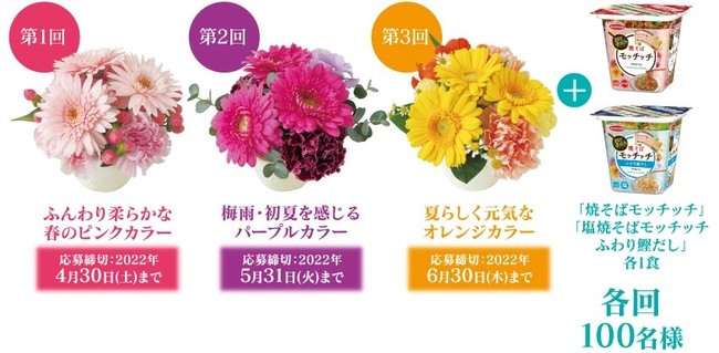 2. LINEからクイズに答えて応募すると、季節のフラワーアレンジメントと焼そばモッチッチのセットが抽選で合計300名様に当たるプレゼントキャンペーン!