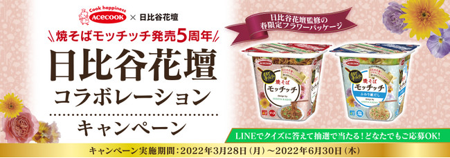 エースコック株式会社(本社:大阪府吹田市 社長:村岡寛)では、「焼そばモッチッチ」と株式会社日比谷花壇(本社:東京都港区)がコラボレーションした【焼そばモッチッチ発売5周年記念!日比谷花壇コラボレーションキャンペーン】を開始させて頂く運びとなりましたので、ご案内申し上げます。