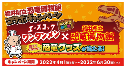 エースコック株式会社(本社:大阪府吹田市 社長:村岡寛)では、4月1日より「福井県立恐竜博物館」とコラボレーションしたキャンペーンを実施します。つきましては、下記要領にて実施いたしますので、ご案内申し上げます。