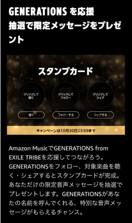 Amazon Musicは、モバイルアプリ上で対象の楽曲を「聴く」、「シェアする」、「フォローする」ことでアーティストを応援する「スタンプカードキャンペーン」を、10月5日(水)より開始します。また、キャンペーン第一弾として、GENERATIONS from EXILE TRIBEが10月3日(月)よりCDリリースに先行して配信し、「第一生命 D.LEAGUE 22-23」のテーマソングになった新曲「My Turn feat. JP THE WAVY」を応援することで、抽選で28名様にあなただけのオリジナル限定音声メッセージをプレゼントする「GENERATIONSを応援して、あなただけの限定音声メッセージが当たるキャンペーン」を開始します。