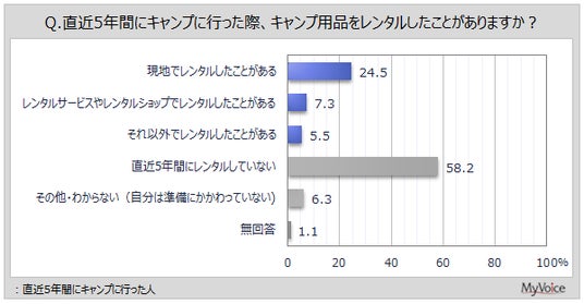 直近5年間にキャンプに行った人のうち、キャンプ用品をレンタルしたことがある人は3割強です。