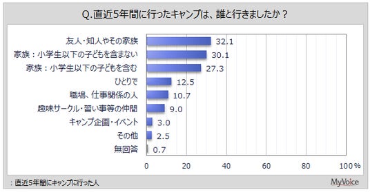 直近5年間にキャンプに行った人に、キャンプの同行者を聞いたところ(複数回答)、「友人・知人やその家族」が32.1%、「家族:小学生以下の子どもを含まない」が30.1%、「家族:小学生以下の子どもを含む」が27.3%です。