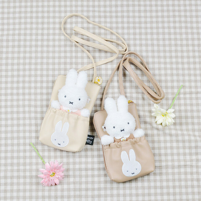 前側のポケットにマスコットを入れて一緒におでかけを楽しめるアイテムです。大き目のスマートフォンも収納可能なサイズで、内生地には「ほわほわマスコット ペールチェックワンピース」と同じチェック柄の生地を使用しています。裏側にはカード入れがついており、ICカードなどを入れることができます。ファスナーの持ち手はデイジーのお花のチャームになっていて、細かな部分までフラワーミッフィーの世界観を感じることができるアイテムです。