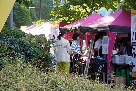 ひまわりガーデン代官山坂で、ピンクのテントが並ぶ華やかなマルシェを開催します。キッチンカーや、洋服や雑貨のブースなどをお楽しみいただけます。