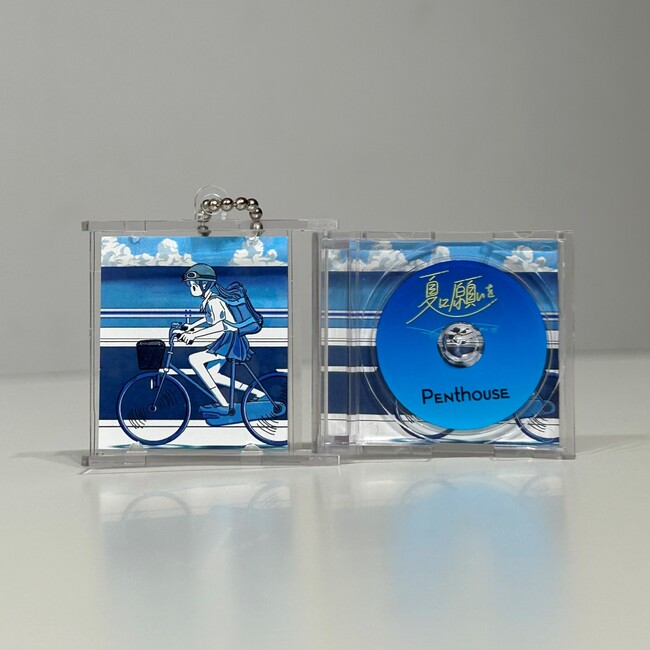 そんな盛り上がりを見せる中、“「夏に願いを」を友達に聴いてもらいたい” “もっと多くの方にPenthouseの魅力を伝えたい!”というファンの声をカタチにする、「ミニジャケキーホルダー」の販売が決定しました。このグッズは、「夏に願いを 公式サポーター証明書」もセットになっています。