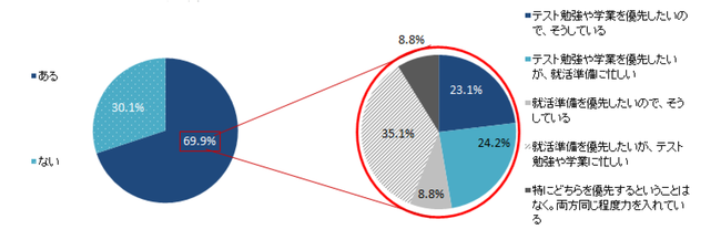 インターンシップ参加や就活準備と学業・定期試験との両立に悩んだ学生が約7割【図1、2、3】