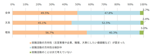 就職活動の方向性(志望業種や企業、職種、大事にしたい価値観など)について「固まった」と回答した割合は49.5%だった。文理でみると、「方向性が固まった」と回答したのは文系で45.1%、理系では56.7%だった。理系学生は一般的に自身の専攻領域と志望業界を関連付けて活動を行う傾向にあることから、文系学生より方向性を固める時期が早かったと思われる。【図5】