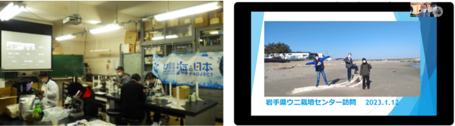 冬休みに、学校教員を対象とした事前研修会をお茶の水女子大学湾岸生物教育研究所にて対面とオンラインのハイブリット形式で開催しました。また、2023年2月には、一般参加の方を対象とした研修会を兼ねたオンライン交流イベント「オンライン相談会」を開催しました。このオンライン相談会では、秋に続いて、冬のイベントにも参加した人達に会の運営を手伝ってもらうことに。今回の特別講師を務めた小学生兄妹は、自分たちが秋のイベントで発生体験を行ったときの経験をもとにした”初心者向けの研修”を行ってくれました。また、秋田県から参加の小学6年生3人組は、秋の体験イベント参加後に、岩手県のウニ養殖所に見学に行ったときの様子をレポートしてくれました。初心者にも安心して実験に取り組んでもらうために始めたオンライン相談会ですが、先輩参加者が「今までのイベントで学んだことを次に伝える」機会にもなっています。一般向けの会なので生徒も参加しやすい、と学校からの参加もありました。