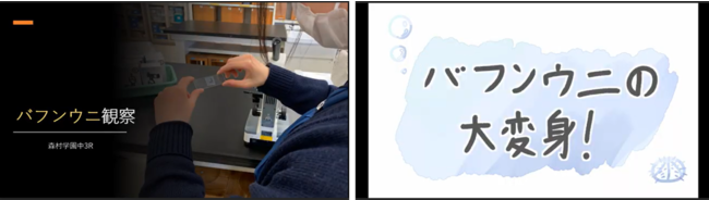 受精実験が完了して幼生飼育も一段落する3月中旬に、一般枠と学校枠からの参加者が一緒に学んだことを発表する発生体験の報告会をオンライン上で開催しました。当日は21件のオンライン参加があり(学校14校、一般5カ所7件)、学校4校と一般3件による報告が行われました。家庭での実験の報告、教材の二次配布のための拠点としても機能してくれている市民サークルからの報告、学校から部活動で参加している生徒の代表者による発表も。また、教員からの授業の報告など、北は北海道から南は九州まで、様々な立場の人がウニの発生実験や幼生飼育という共通項で繋がり、皆で学んだことを共有しました。当日都合がつかない人のために「後日録画を視聴する」という参加形態も設け、そちらにも30名の登録がありました。