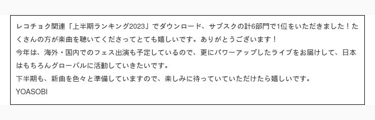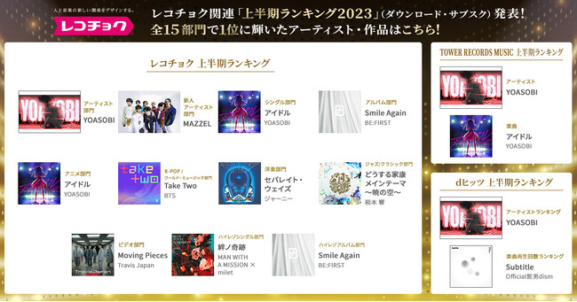 YOASOBIは、ダウンロードランキングである「レコチョク上半期ランキング2023」ではアーティストランキング部門、シングルランキング部門、アニメランキング部門の計3部門で1位。サブスクランキングの「TOWER RECORDS MUSIC 2023 上半期再生ランキング」は2部門を制覇、「dヒッツ上半期ランキング2023」楽曲再生回数ランキングでは1位を獲得。計6冠獲得と、2023年上半期ランキングは、YOASOBIと「アイドル」が席巻しました。