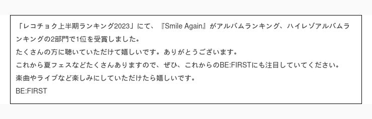 なお、BE:FIRSTは「TOWER RECORDS MUSIC 2023 上半期再生ランキング」アーティストTOP10で3位、「Smile Again」が楽曲TOP10でも3位にランクインしています。